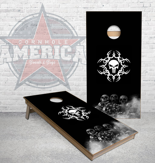 View full detailsSkulls piled up in smoke with skull logo custom Cornhole Boards