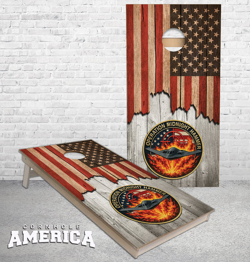 View full detailsJagged US Flag Operation Midnight Hammer cornhole boards