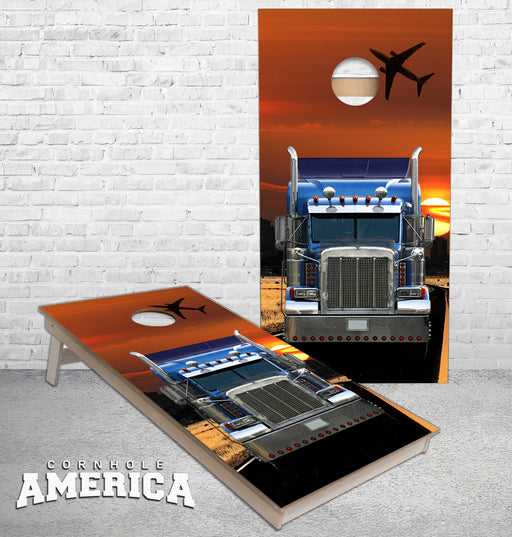 View full detailsSemi Truck with Jet flying in the rear view cornhole boards