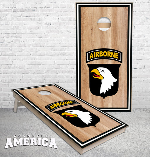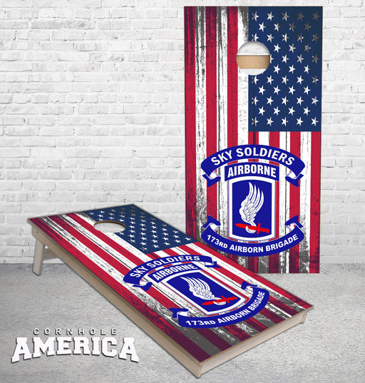 View full details173rd Airborne Brigade on distressed wood US Flag cornhole boards