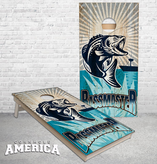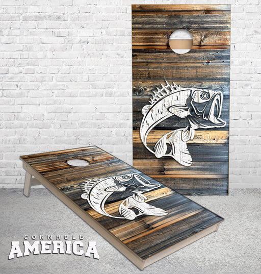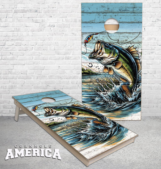 View full detailsLarge Mouth Bass Jumping out of the water on Rustic wood plank cornhole boards