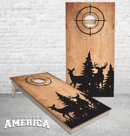 View full detailsDoe and Buck silhouette on medium brown cornhole boards