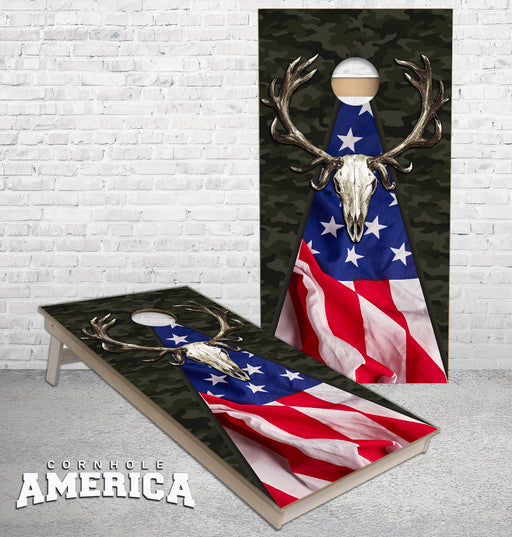View full detailsDeer Skull US Flag triangle theme cornhole boards