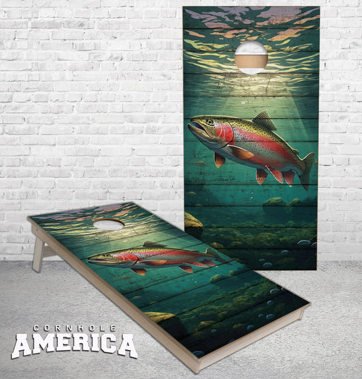 View full detailsRainbow Trout in stream on weathered horizontal wood cornhole boards