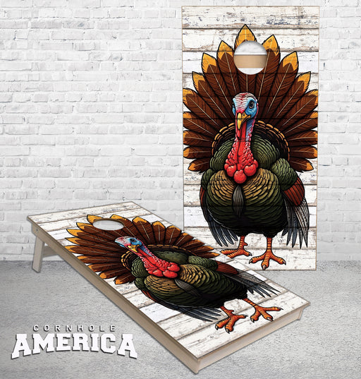 View full detailsHNT 059 Wild Turkey Fanning Feathers on Weathered wood cornhole boards