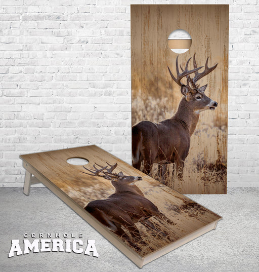 View full detailsWhite Tail Buck Eating in a Corn Field weathered wood cornhole boards