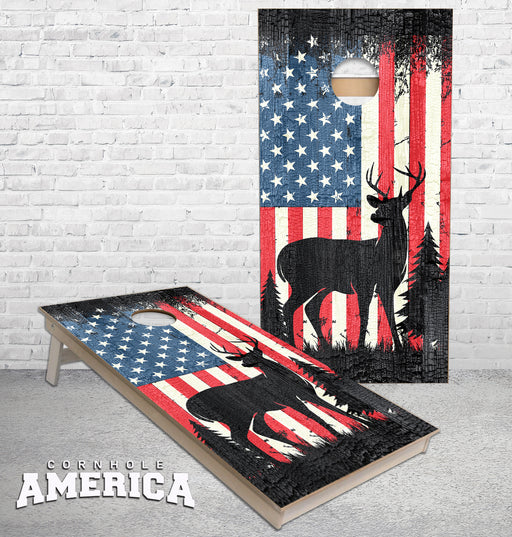 View full detailsUS FLAG and Buck Deer on Charcoal burnt wood cornhole boards