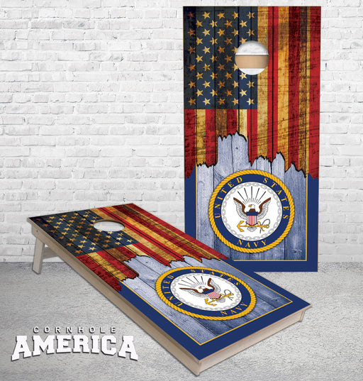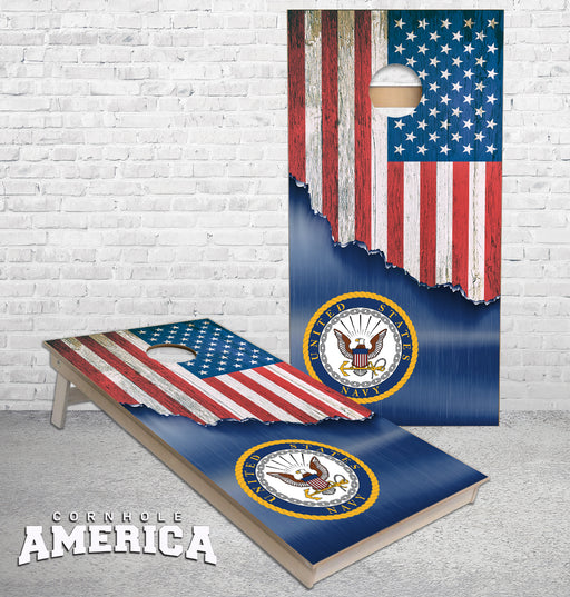 View full detailsJagged US Flag with United States Navy Emblem cornhole boards