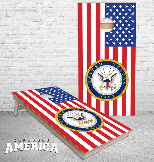 View full detailsNavy Logo on US Flag cornhole boards