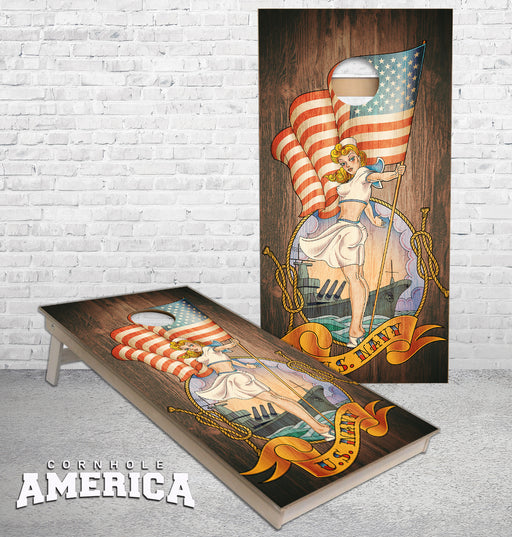 View full detailsUS Navy weathered wood Pin up Girl US Flag cornhole boards
