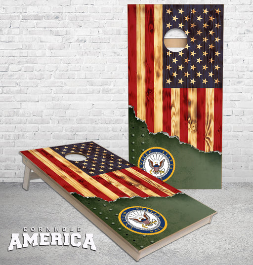 View full detailsUS Navy Torn Metal with burnt wood us flag cornhole boards